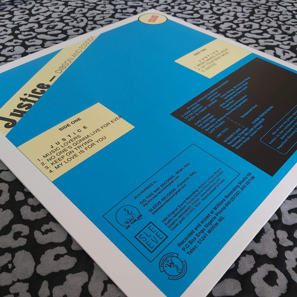 Following the 1960 Nigerian liberation from Western colonization, Nigeria began to use music to vibrate everyone into a place of harmony and community. The majority of pressings that came out from within the Nigerian state paired disco, funk infused beats with strong, political lyrical statements. In this release from Dibson & Essody, the political undertones of “Justice” blended with the smoldering grooves of “Music Lovers” and “Let Your Body Move” classify this disco under the monumental must-haves of Nigeria from the early 1980s.Side one kicks off with a heavy rhythmical beat, driven by funky synthesizers in a track called “Music Lovers”. Followed by a lyrically driven track, “No Ones Gonna Live Forever”, with vocals resonating over percussions and flugelhorns. Side two is packed with two goodies: “Let Your Body Move”, composed of a funky bass line and layers of percussions, and then the famous “Justice” track that combines catchy guitar riffs with memorable piano chord progressions.Stamped under one of the most esteemed labels Wilfilms, owned by the most enigmatic figures in Nigerian music, William Onyeabor, Dibson & Essody’s “Justice” is one for the taking. Dig This Way and Sleeve Records are happy to take the reigns on this one to make sure this funky themed disco will be available for all to hear.